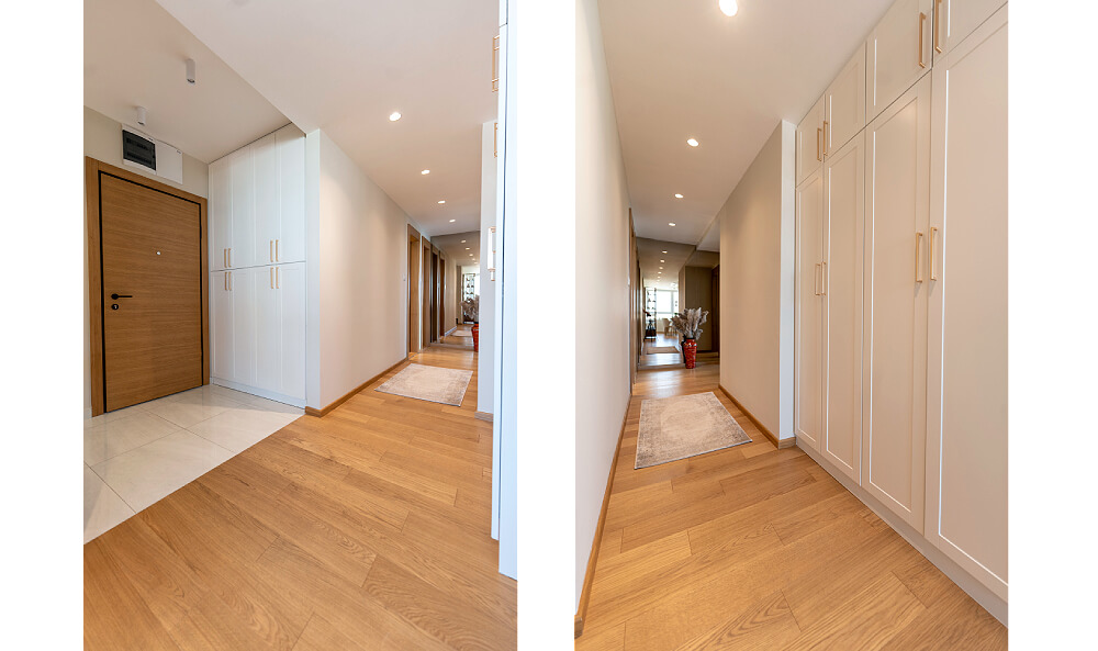 In the master bathroom, there is a concealed space for laundry, all designed to maximize space utilization. The second bathroom features a shower cabin with a simple and modern design.