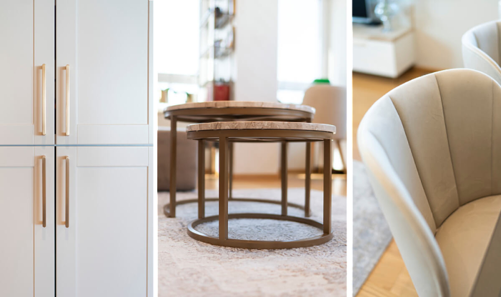 The living room flows seamlessly into the dining area, then continues into the kitchen and terrace. The dining table is designed to visually maintain the spaciousness of the area and not distract attention. Additional elements like a glass display cabinet for porcelain dishes add a personal touch to the space.